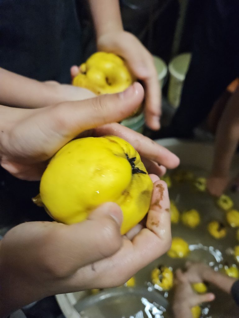 Wir haben die Quitten gründlich gewaschen – das war gar nicht so einfach, weil wir dabei die ganze Zeit in der Hocke arbeiten mussten. Danach wurden die Quitten gehäckselt. Das